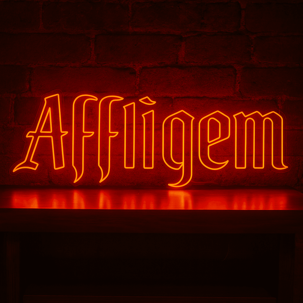 Savourez l’authenticité belge avec le néon Affligem. Ses lettres rouges éclatantes reproduisent fidèlement la typographie caractéristique de cette bière d’abbaye légendaire fondée par des moines bénédictins.