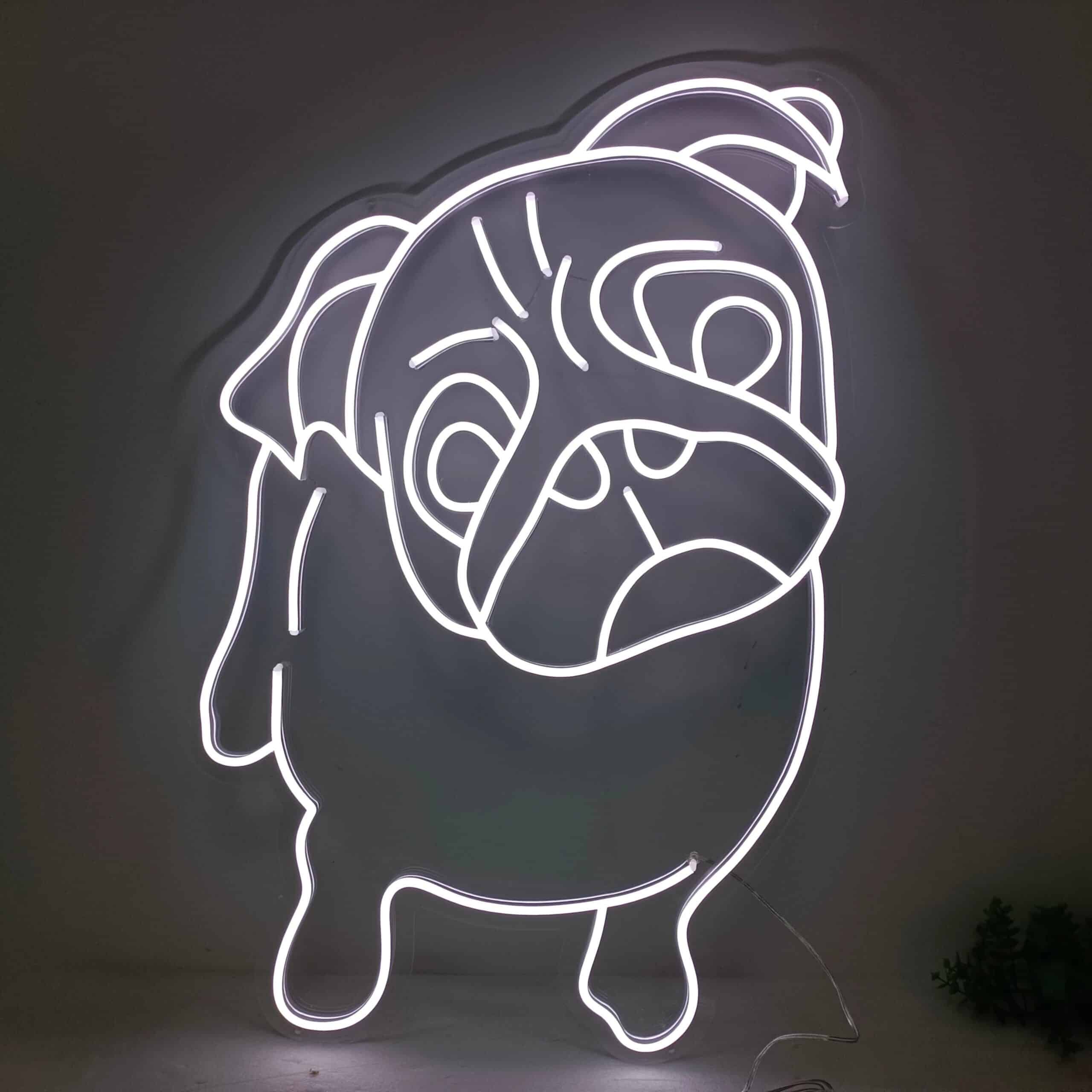 L’expression douce et mélancolique du carlin, fidèlement reproduite dans ce néon, évoque la personnalité calme et attachante de ces chiens réputés pour leur loyauté.