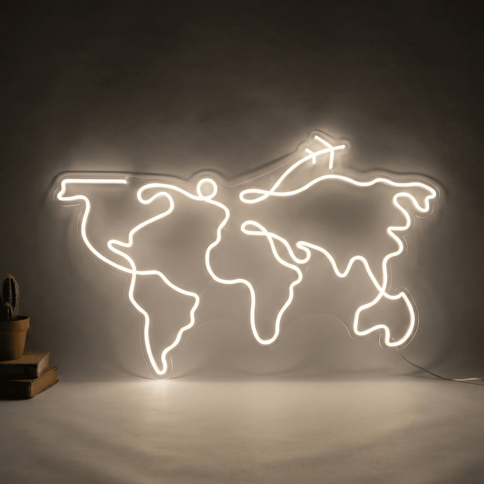 Le Néon Carte du Monde représente les continents de notre planète dans un style épuré et minimaliste, tracés par des lignes lumineuses blanches continues.