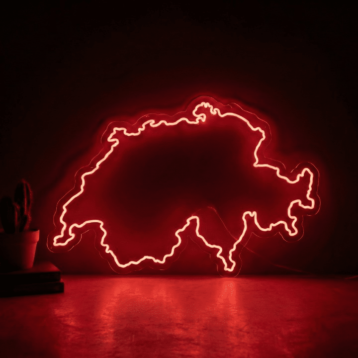Le Néon Carte Suisse reproduit fidèlement les contours géographiques de la Confédération helvétique dans un éclairage rouge vif.
