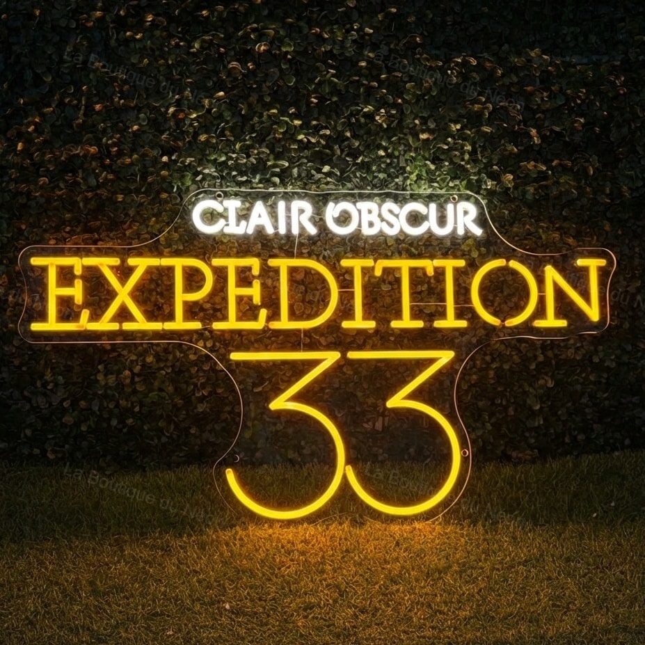 Le Néon Clair Obscur Expedition 33 représente un logo lumineux composé de texte en lettres dorées disposé sur deux lignes distinctes.