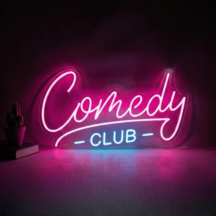 Le Néon Comedy Club affiche l’inscription “Comedy Club” en lettres cursives élégantes, où “Comedy” apparaît en rose vif lumineux tandis que “Club” s’illumine en bleu électrique.
