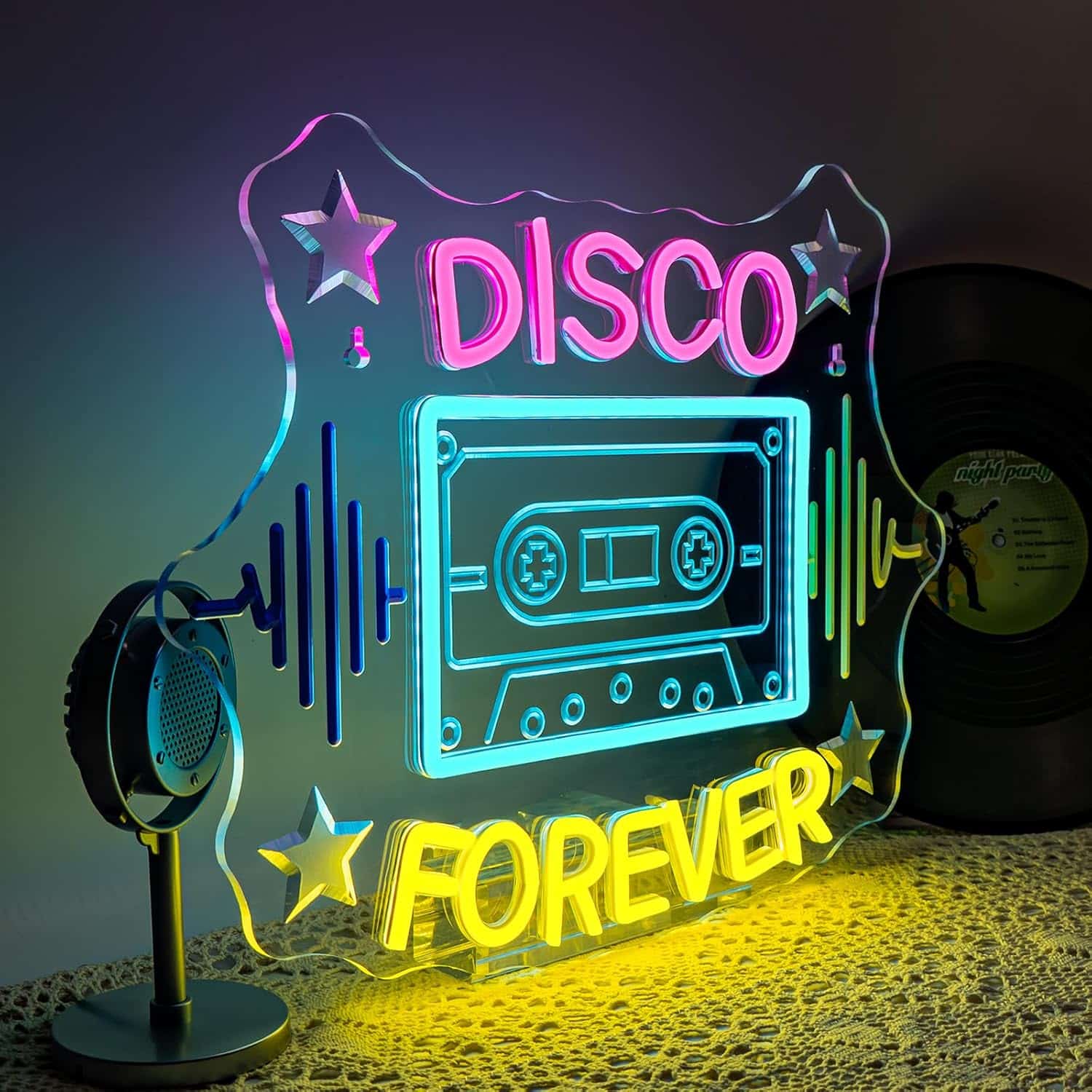 Le Néon Disco Forever représente l’univers musical des années 70 et 80 avec une cassette audio stylisée entourée des mots “DISCO” et “FOREVER”.