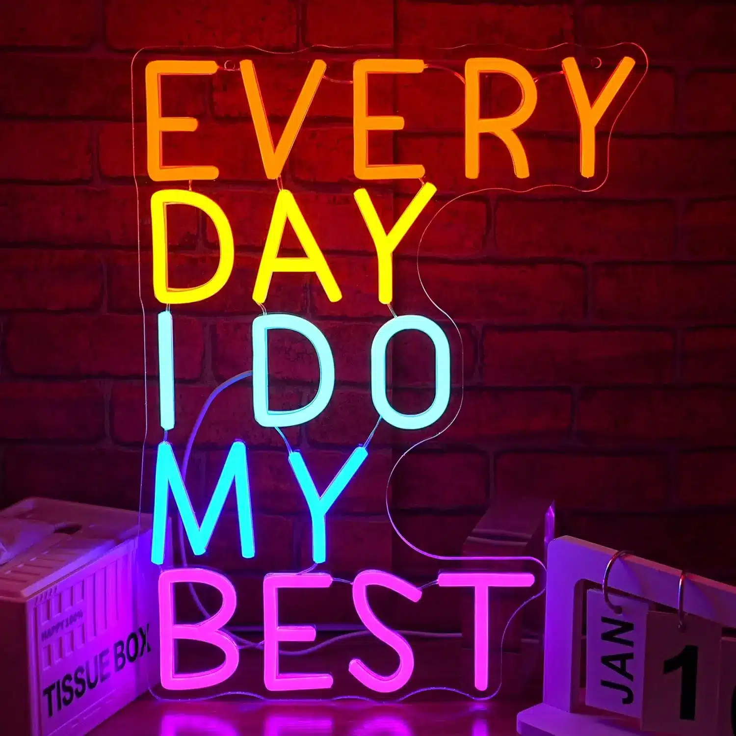 Motivez-vous chaque jour avec le néon “Every Day I Do My Best”, orné d’un superbe dégradé orange, jaune, bleu turquoise et rose aux lettres modernes parfaitement définies.