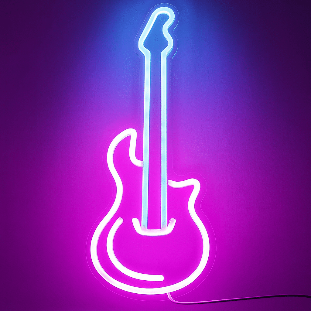 Ce néon représente les contours épurés d’une guitare électrique, capturant l’essence de cet instrument iconique du rock.