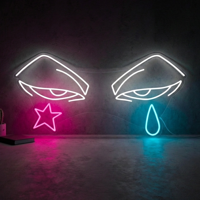 Ce néon met en scène deux yeux stylisés aux paupières mi-closes, dessinés dans une teinte blanche éclatante, créant cette expression caractéristique et inquiétante propre à Hisoka Morow.