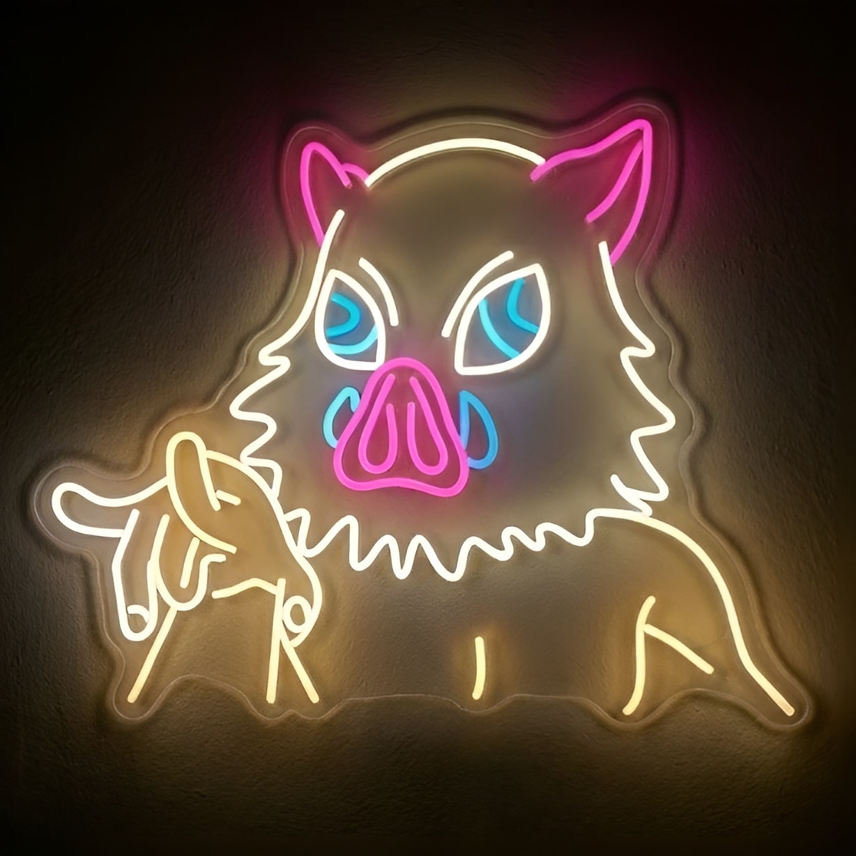 Le Néon Inosuke Hashibira (Demon Slayer) représente le personnage emblématique de l’anime japonais avec son masque de sanglier distinctif aux oreilles roses et aux yeux bleus perçants.