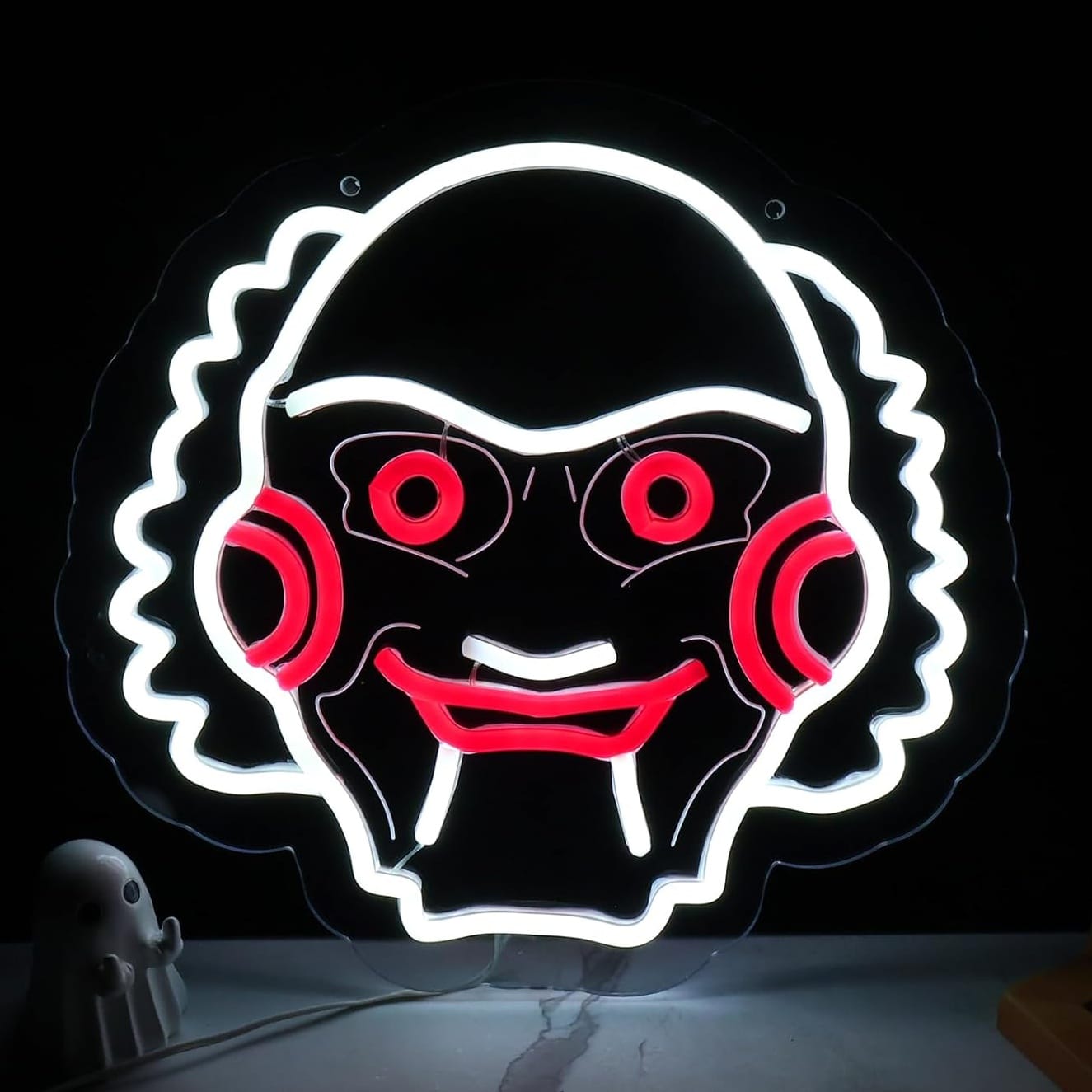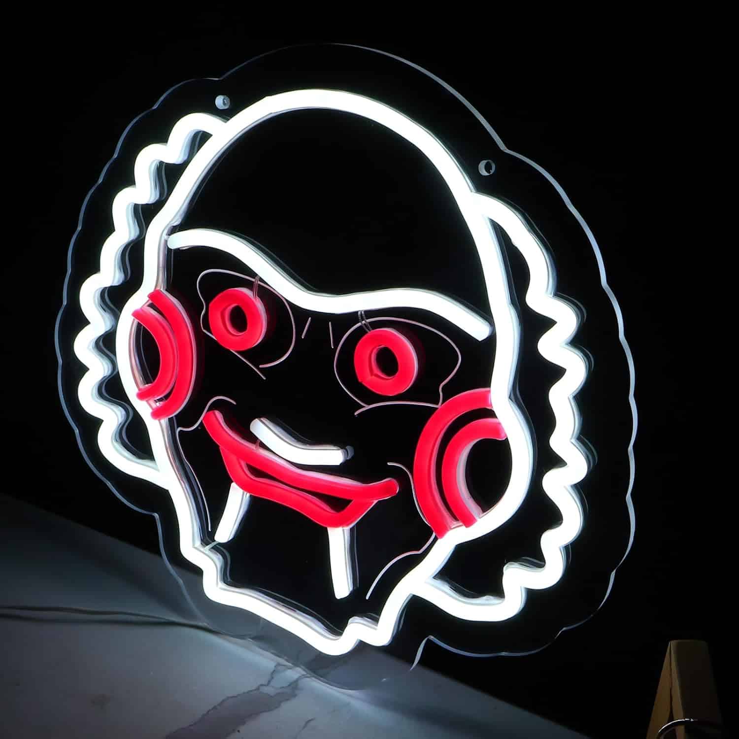 Le Néon Jigsaw Saw représente le masque iconique de Billy, la marionnette terrifiante de la saga cinématographique Saw.