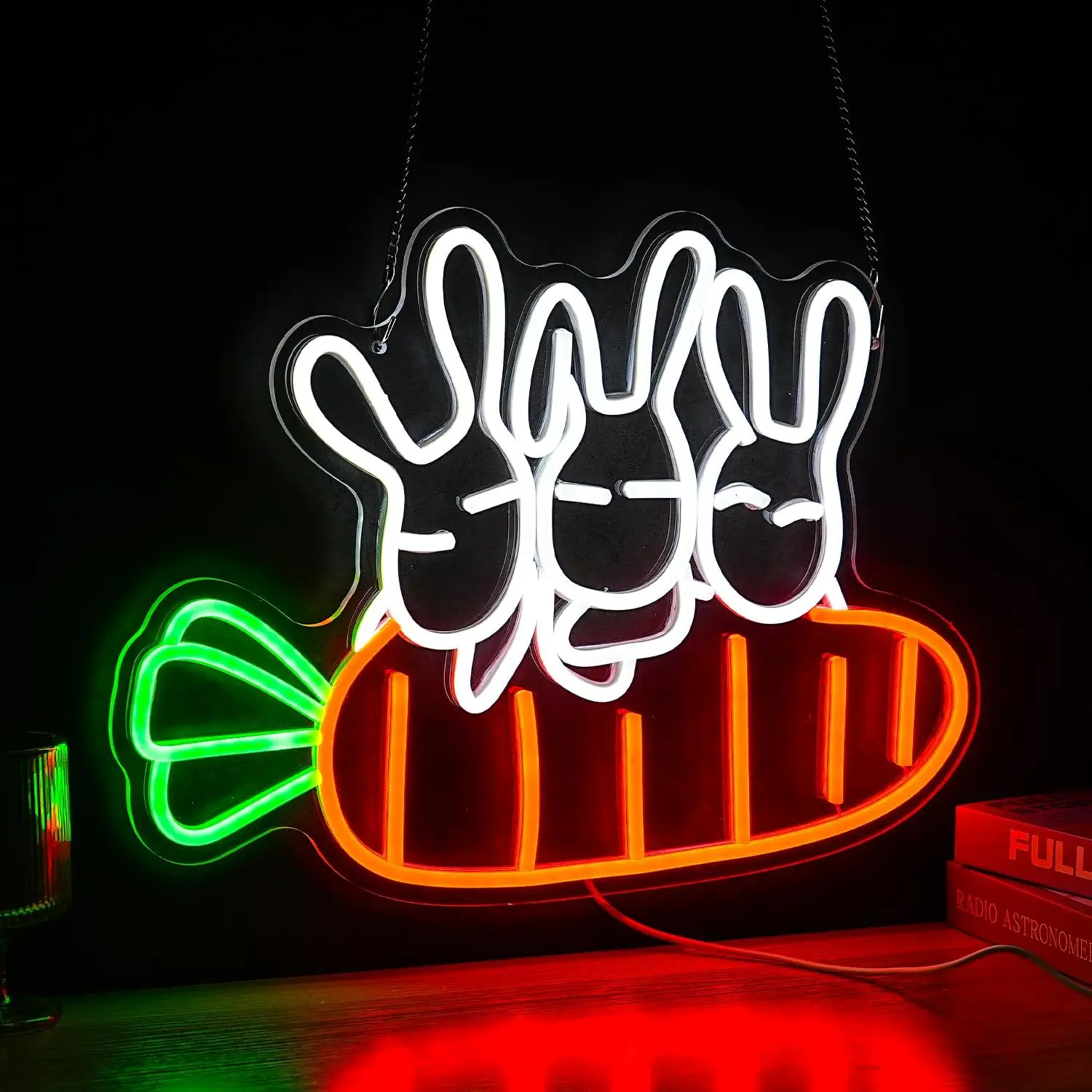 Ce Néon Lapins Carotte évoque l’univers tendre de l’enfance et des contes pour enfants, où les lapins sont souvent représentés comme des créatures douces et gourmandes, particulièrement friandes de carottes.