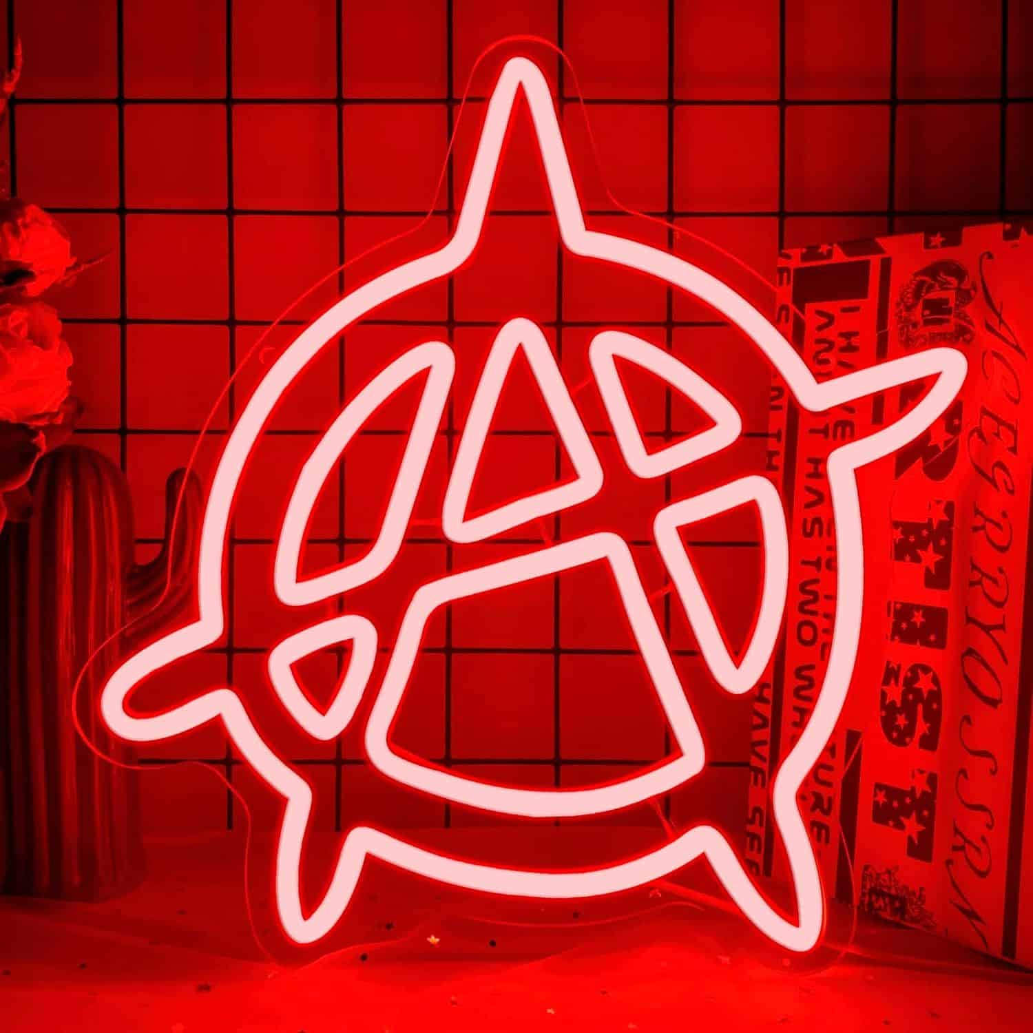 Le Néon Logo Anarchie représente le célèbre symbole anarchiste composé d’un A majuscule entouré d’un cercle, le tout illuminé en rouge vif.