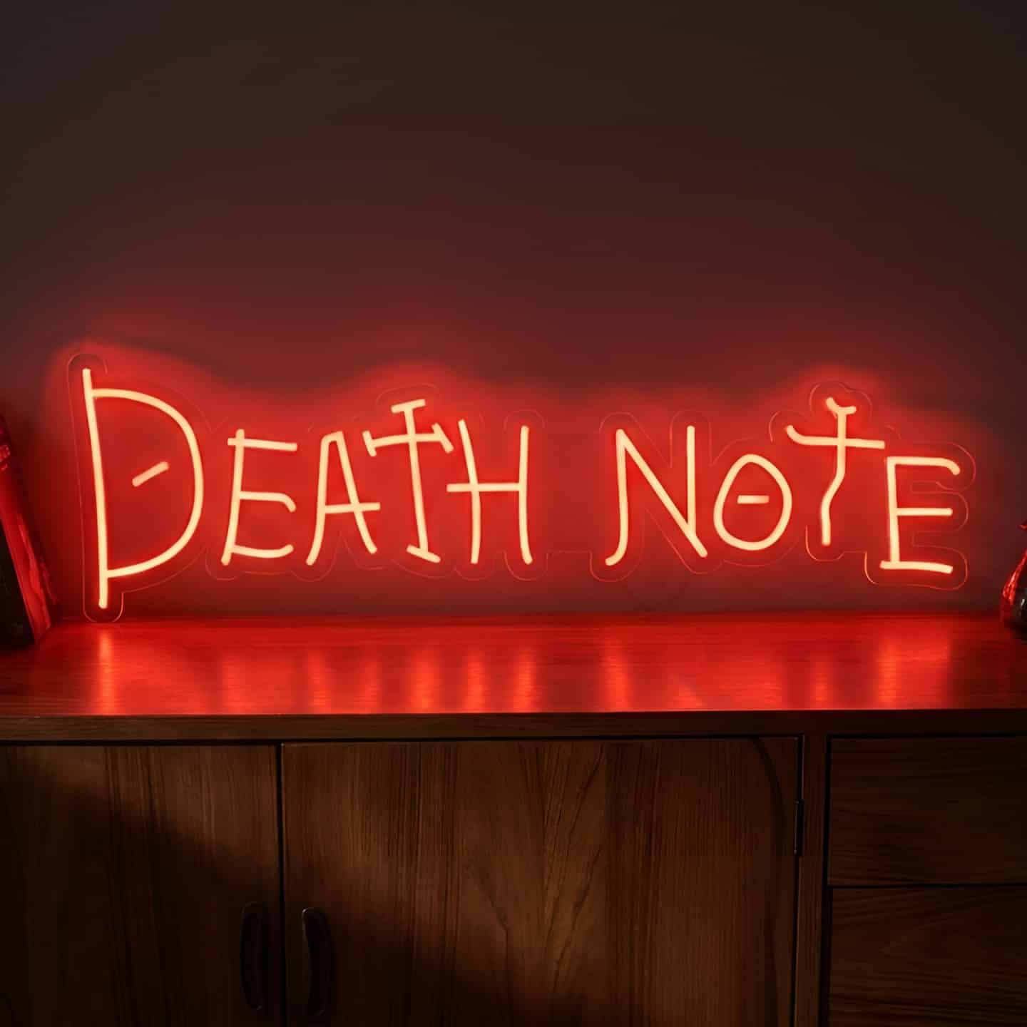 Ce néon affiche les mots “DEATH NOTE” en lettres rouges lumineuses, reprenant exactement la typographie caractéristique de l’œuvre originale.
