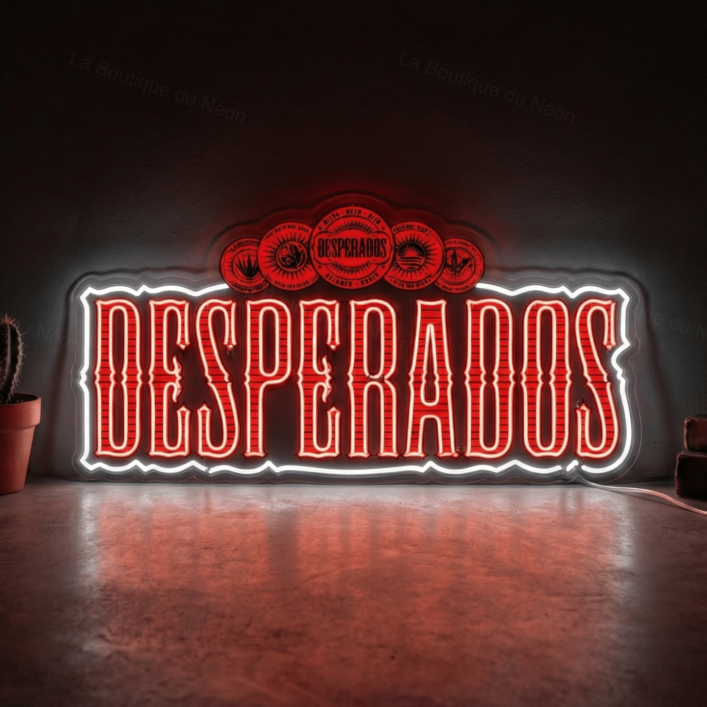 Le néon affiche le nom “DESPERADOS” en lettres capitales rouges lumineuses, avec un contour blanc qui fait ressortir chaque caractère de manière saisissante.
