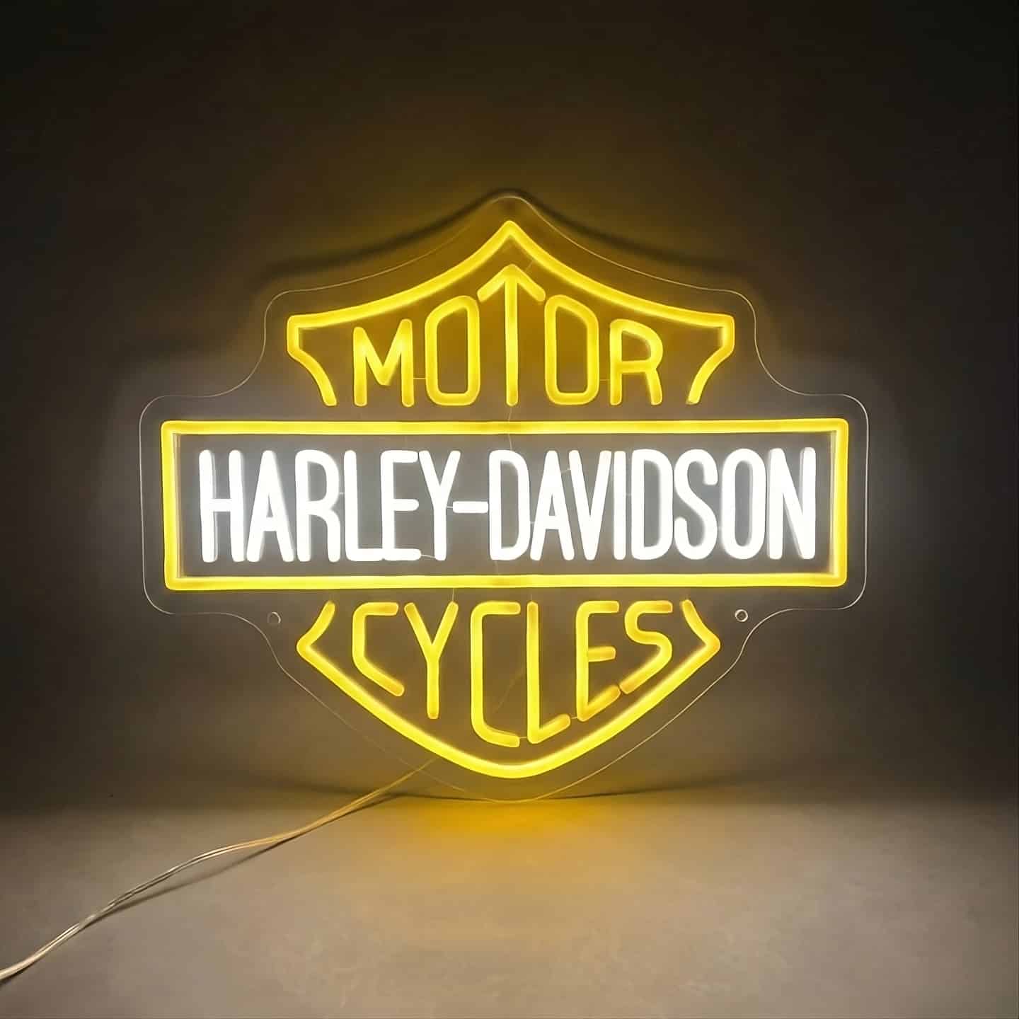 La partie inférieure du Néon Logo Harley Davidson présente le mot “CYCLES” dans la même typographie que “MOTOR”, complétant ainsi la signature complète de la marque.