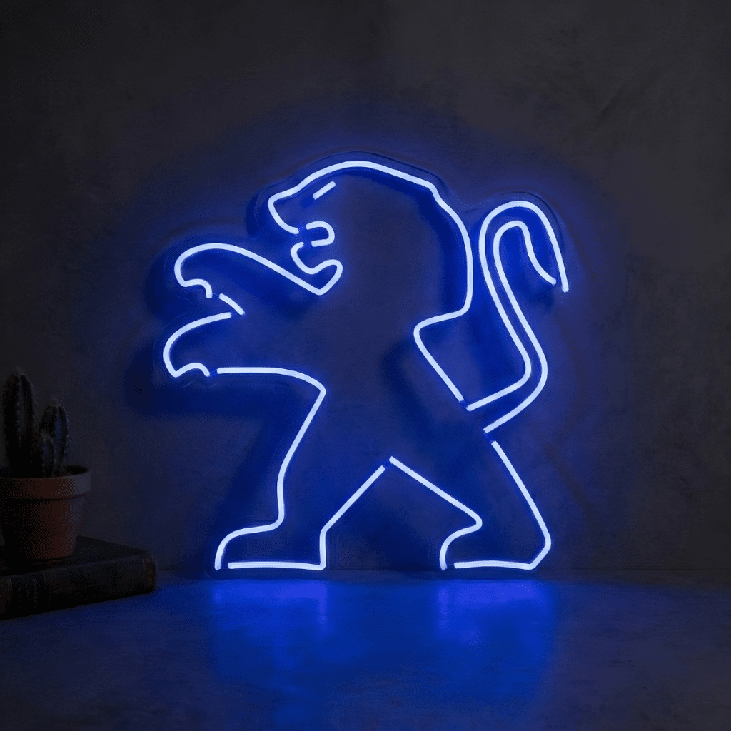Le Néon Logo Peugeot reproduit fidèlement l’emblème du constructeur automobile français : un lion dressé sur ses pattes arrière dans une posture majestueuse et conquérante.