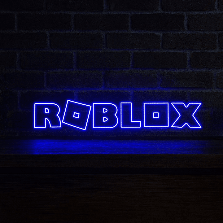 Ce néon affiche le mot “ROBLOX” en lettres capitales bleues lumineuses, avec le “O” caractéristique remplacé par un carré incliné qui fait la signature visuelle de la marque.