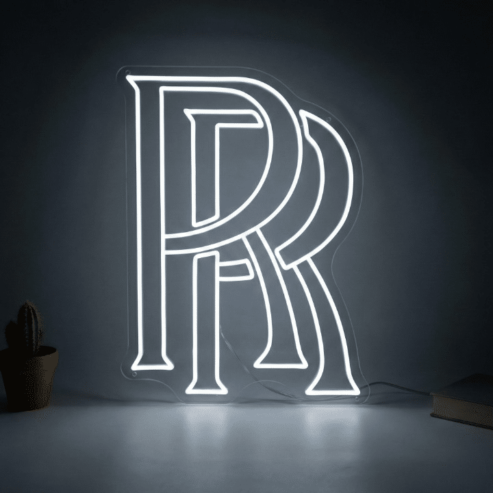 Le Neon Logo Rolls-Royce reproduit fidèlement l’emblématique monogramme RR entrelacé de la célèbre marque automobile britannique.