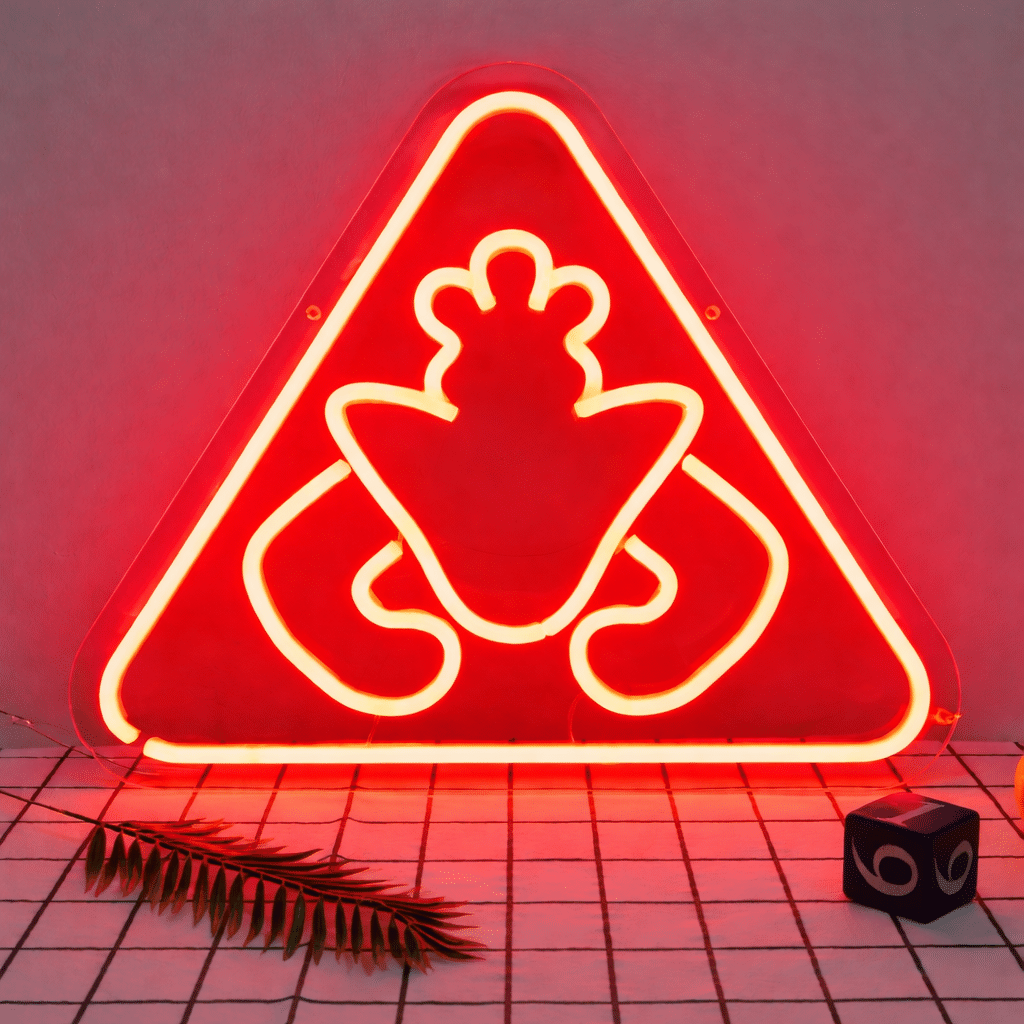 Ce néon affiche la silhouette stylisée de Freddy Fazbear, le personnage principal de la série, reconnaissable à ses oreilles rondes caractéristiques et son museau distinctif, le tout inscrit dans un triangle aux contours lumineux.
