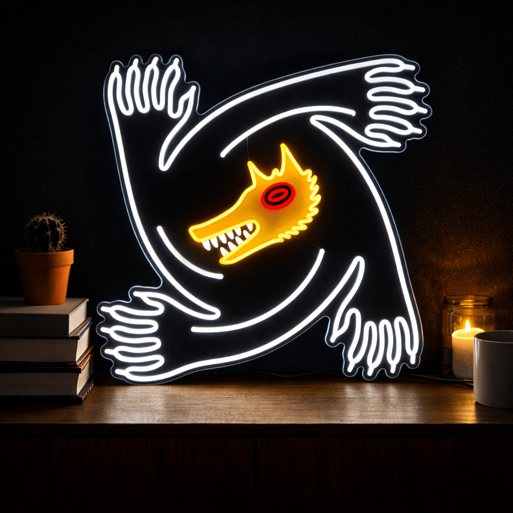 Le Néon Loup-Garou de Thiercelieux représente une silhouette anthropomorphe en pleine transformation, avec une tête de loup aux crocs apparents qui remplace le visage.