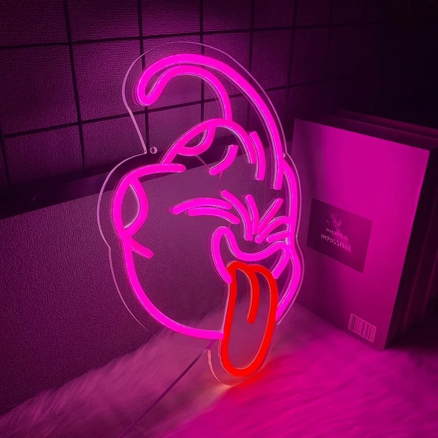 Plongez dans l’univers de Dragon Ball Z avec le néon Majin Buu. Son visage souriant aux yeux ronds, nez pointu et langue tirée capture parfaitement l’esprit espiègle et malicieux du personnage en lignes lumineuses roses.