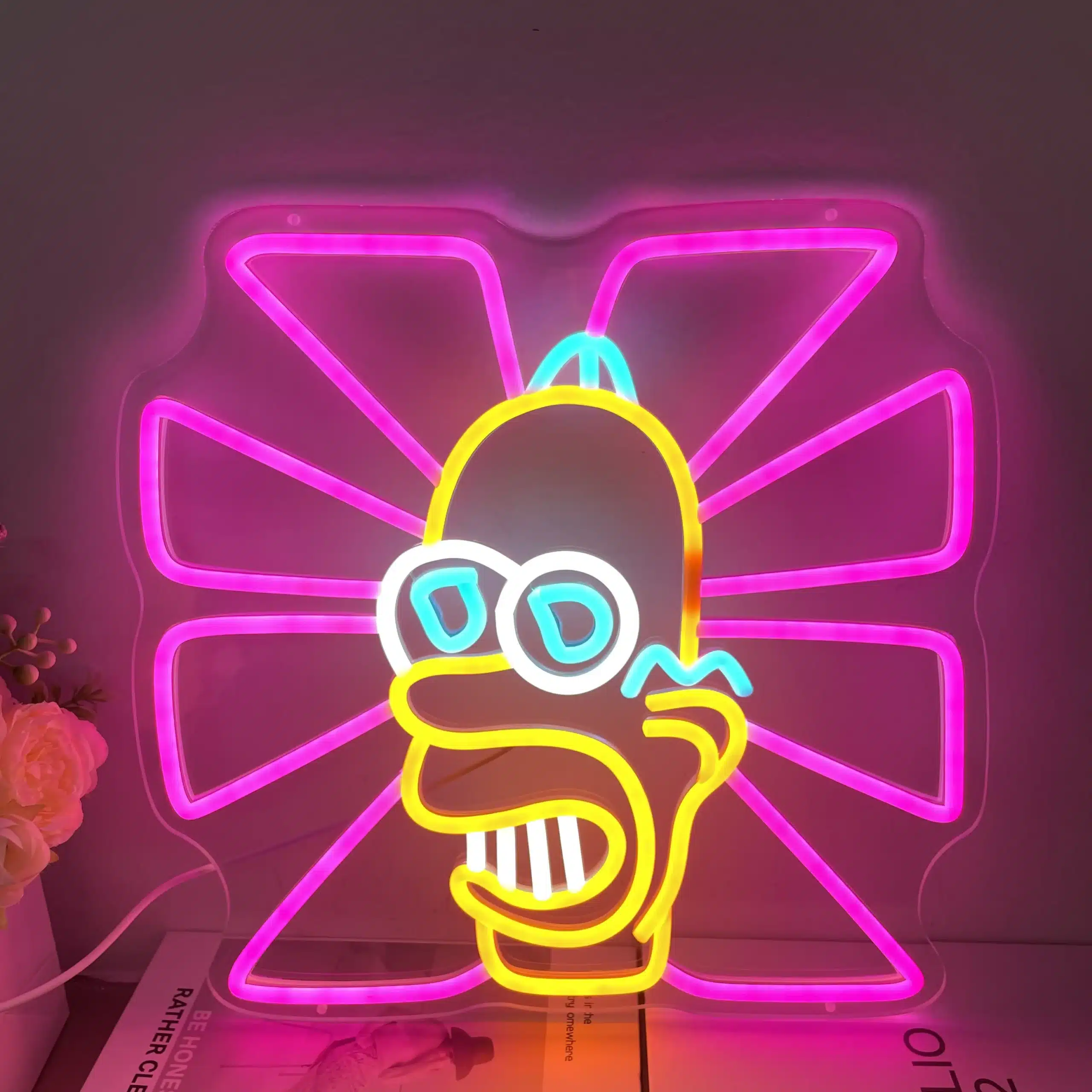 Ce Néon Monsieur Scintillant met en avant la tête d’Homer dans un jaune vif emblématique, entourée d’une fleur psychédélique rose fuchsia rappelant l’esthétique publicitaire kitsch et exagérée du Japon des années 90.