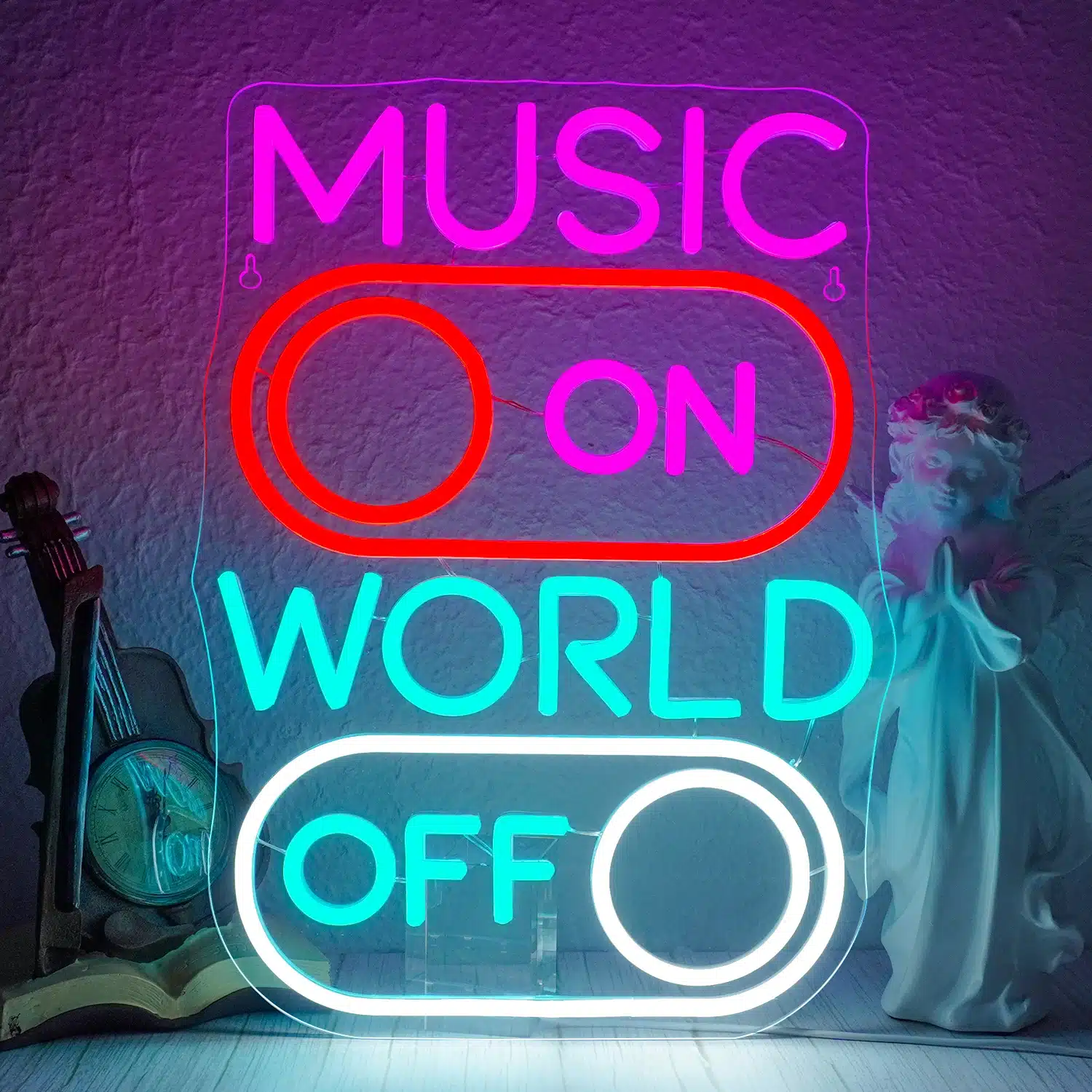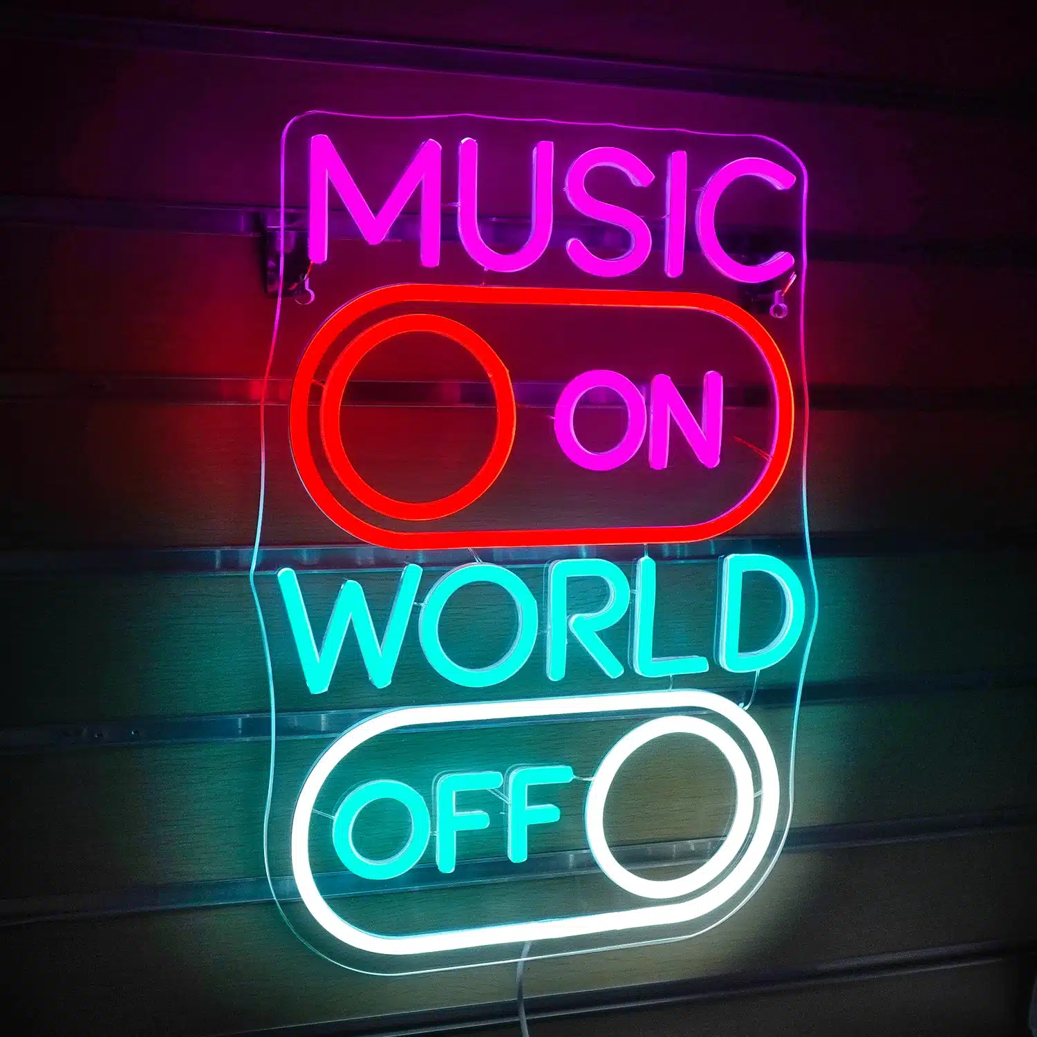 Ce néon affiche “MUSIC ON” (musique activée) en lettres roses vives au-dessus d’un interrupteur rouge en position “ON”, tandis que “WORLD OFF” (monde désactivé) apparaît en lettres bleues turquoise sous un interrupteur blanc en position “OFF”.