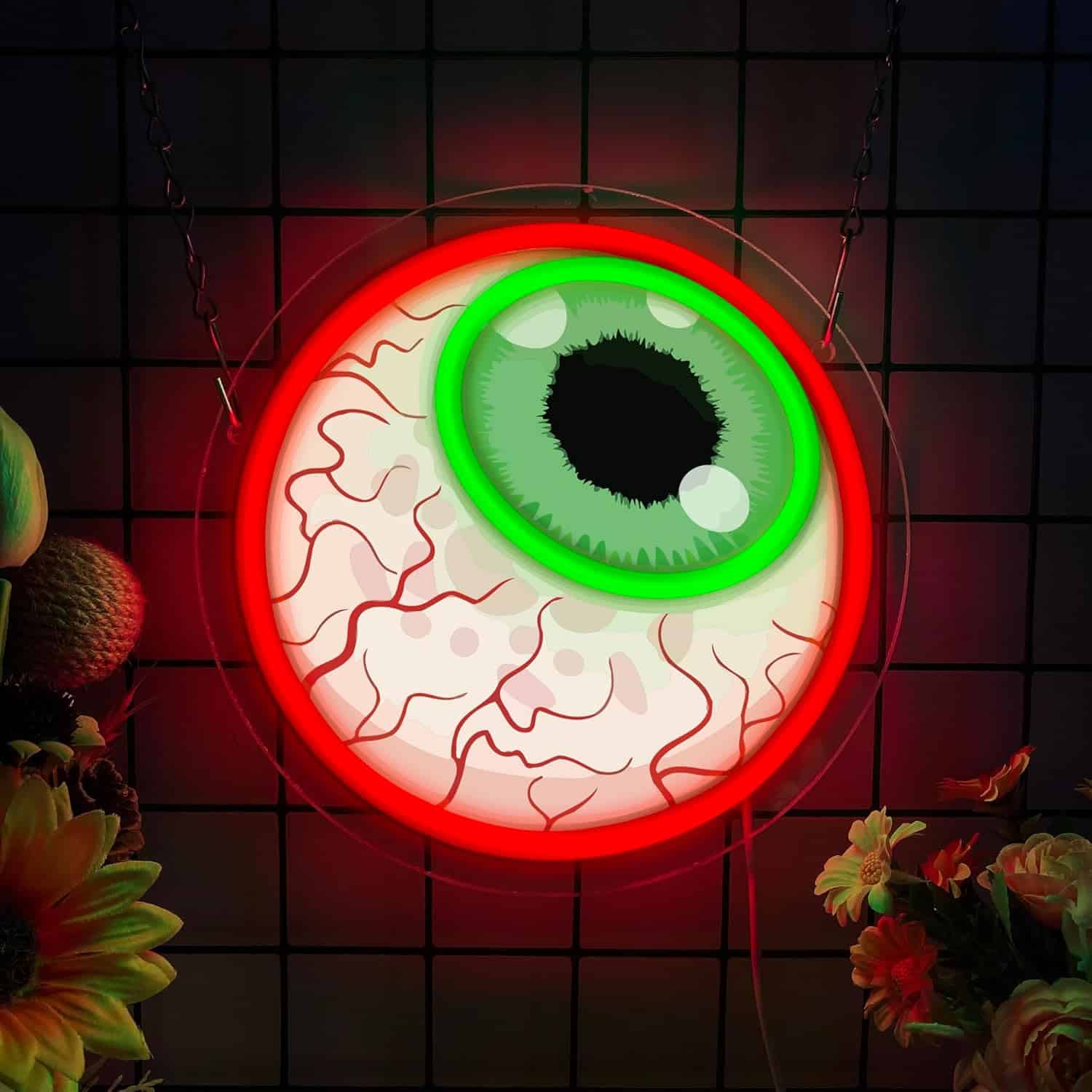 Le Néon Oeil Sanguinolent représente un œil humain géant aux détails saisissants, avec un iris vert vif entouré d’une pupille noire centrale.