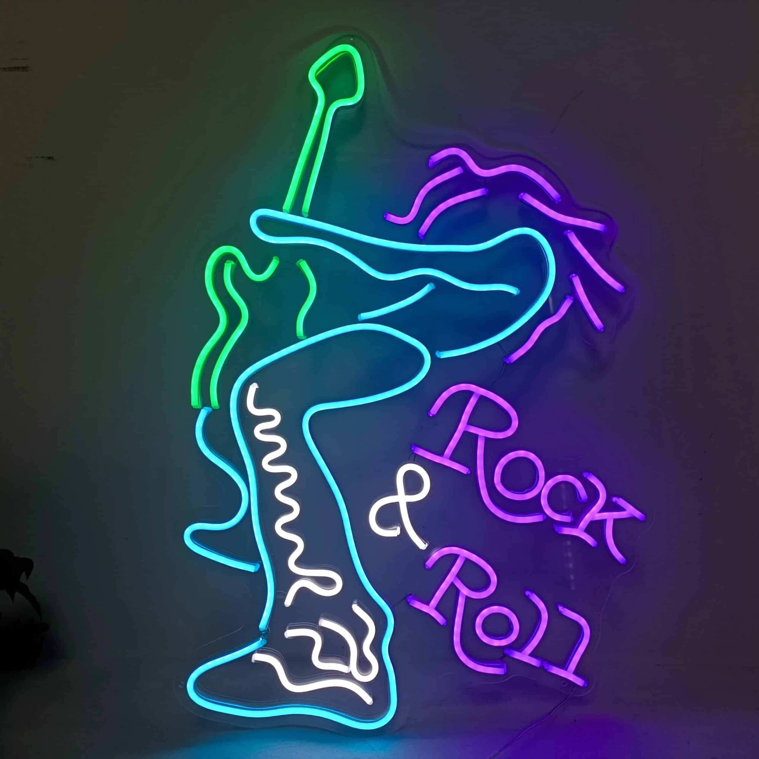 Le Néon Rock and Roll représente un rockeur aux cheveux longs en mouvement tenant une guitare électrique, accompagnée de l’inscription “Rock & Roll” en lettres stylisées.