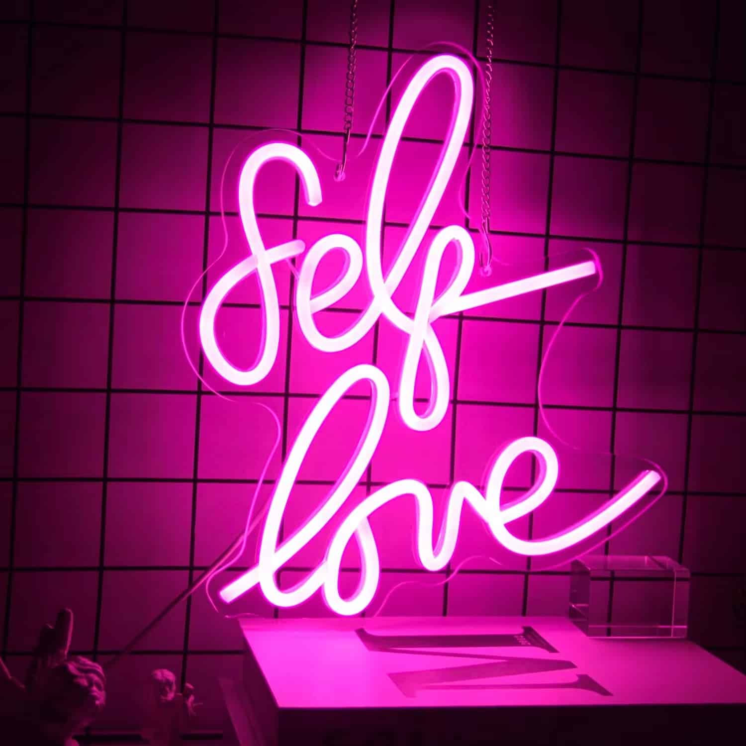 Ce néon rose vif affiche les mots “Self Love” en écriture manuscrite élégante, répartis sur deux lignes distinctes.