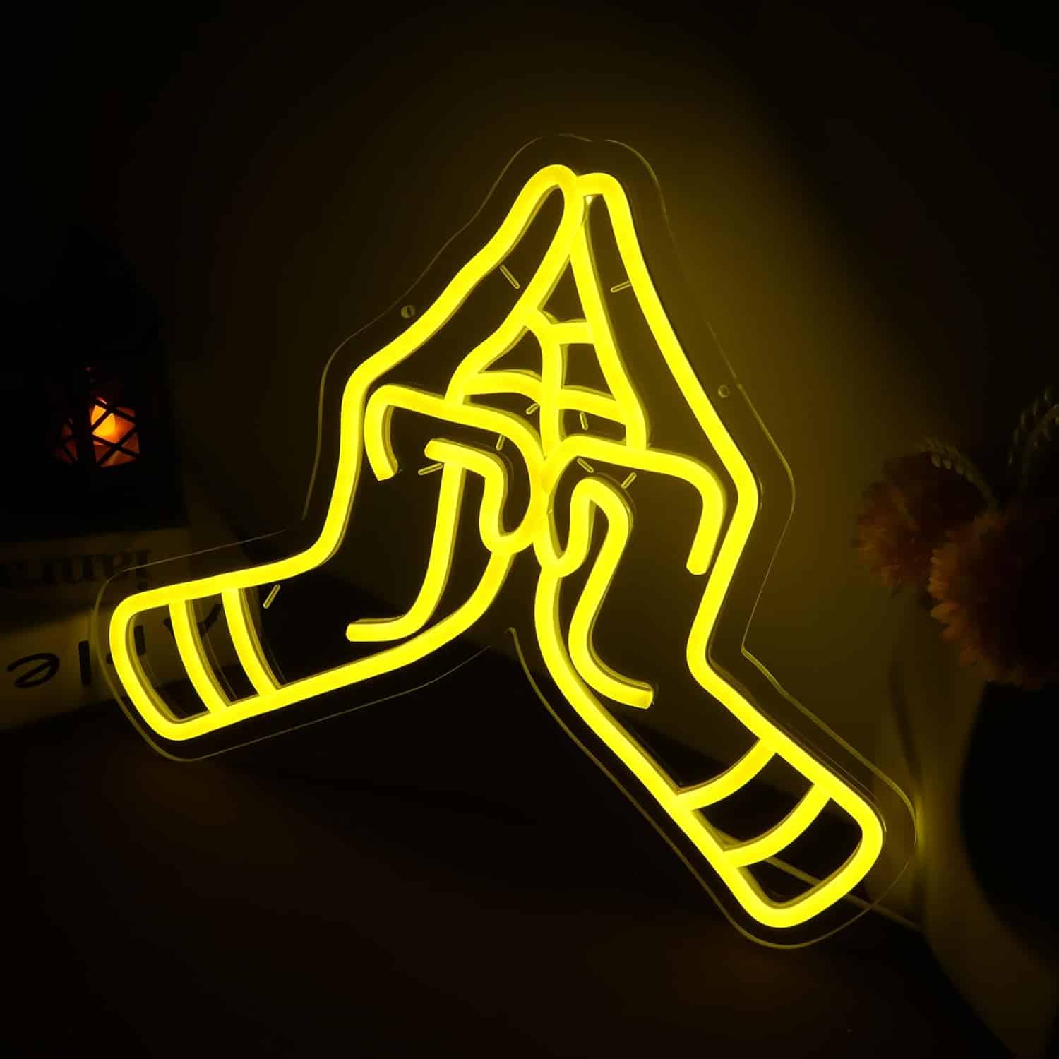 Le Néon Signe Mudra (Naruto) représente deux mains jointes en position de prière ou de méditation, illuminées d’un jaune vif éclatant.