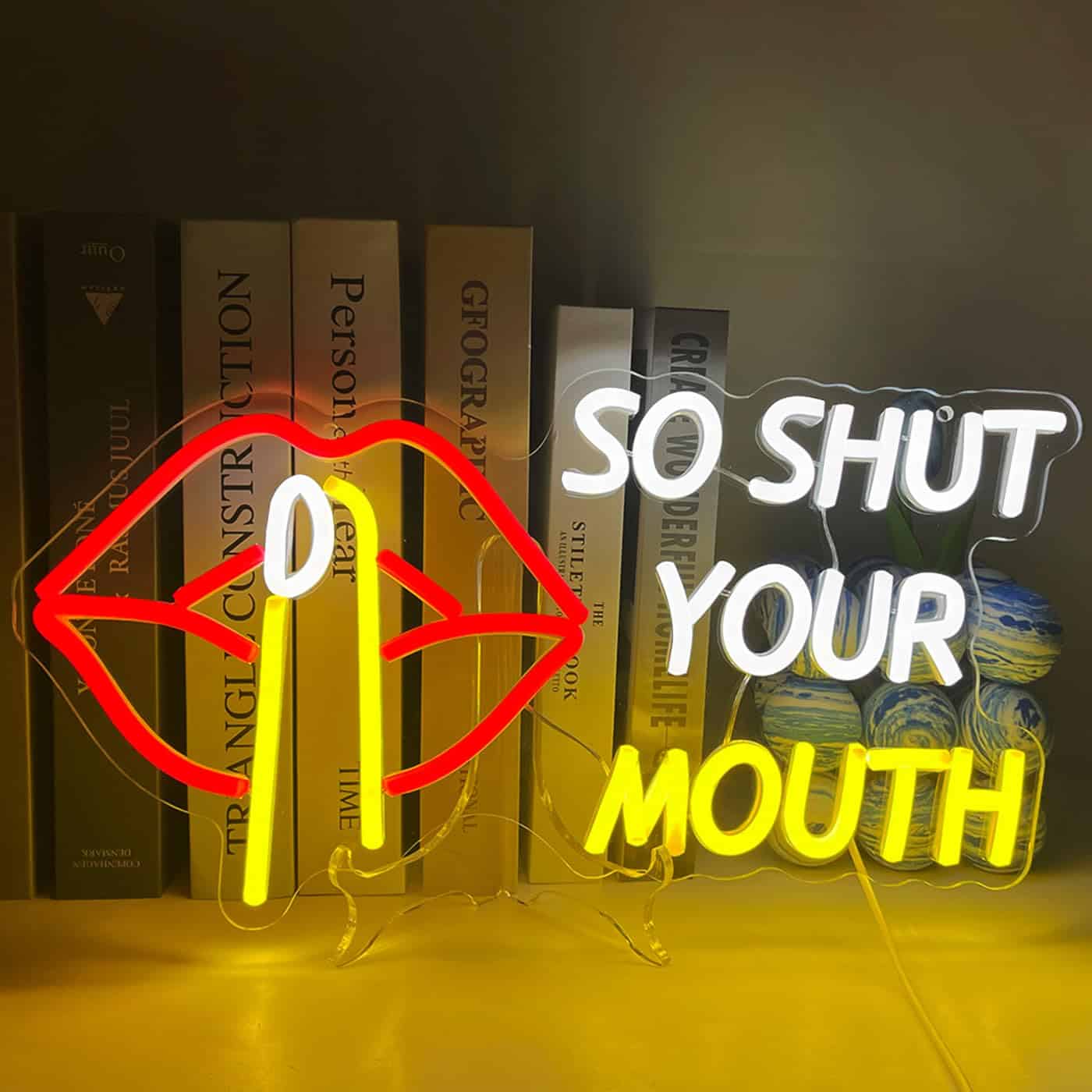 Exprimez votre côté rebelle avec le Néon So Shut Your Mouth. Une bouche rouge stylisée accompagnée d’un doigt et du message provocateur en lettres blanches et jaunes lumineuses.