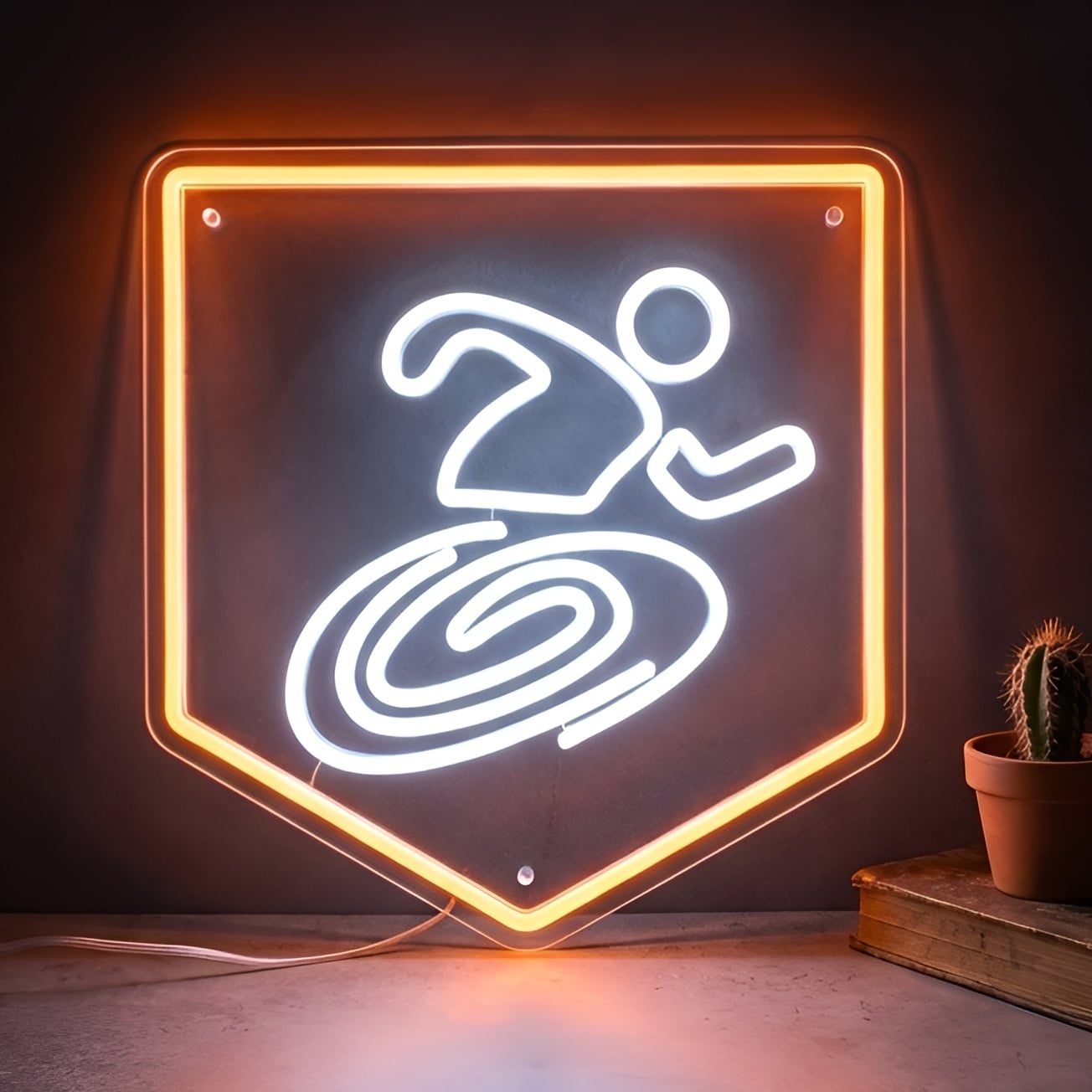 Le néon reproduit fidèlement l’écusson caractéristique de Stamin-Up : une silhouette dynamique en mouvement, portée par une spirale énergique symbolisant la rapidité et l’élan continu. Le contour jaune/orange lumineux renforce l’effet d’énergie et de puissance.