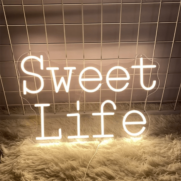Le Néon Sweet Life affiche les mots “Sweet Life” en lettres cursives lumineuses, où “Sweet” apparaît sur la ligne du haut et “Life” sur celle du bas.
