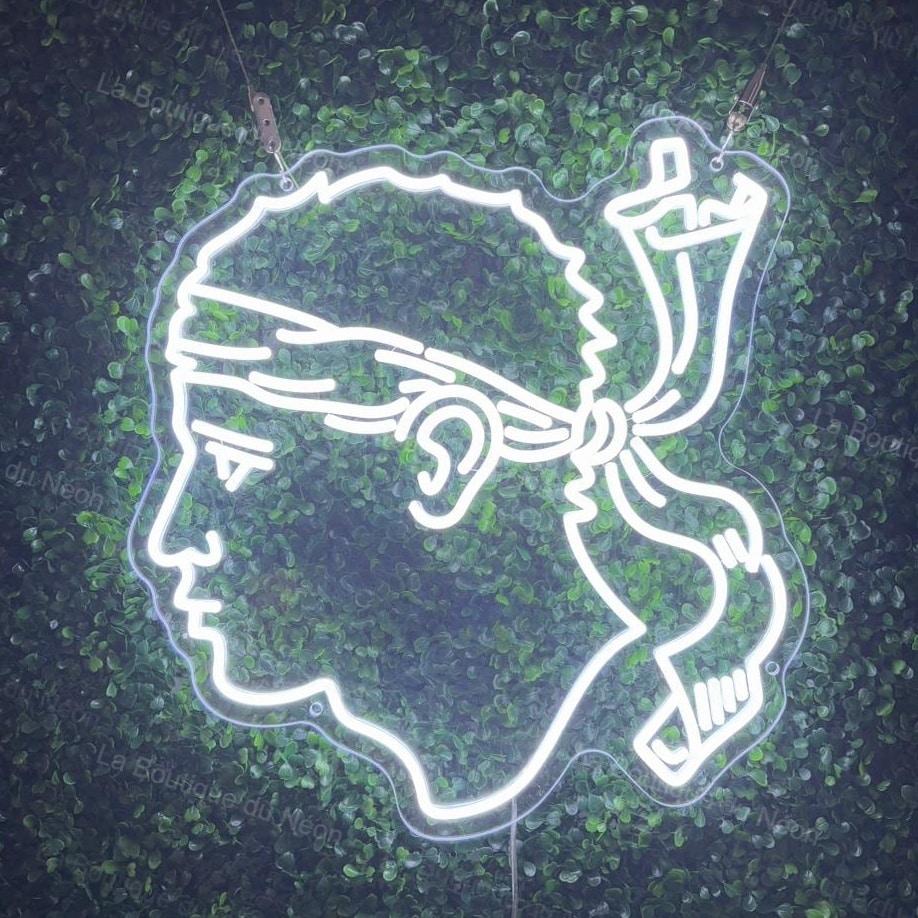 Le Néon Tête de Maure Corse représente le symbole emblématique de la Corse, montrant un profil masculin de couleur blanche avec un bandeau noué autour du front.