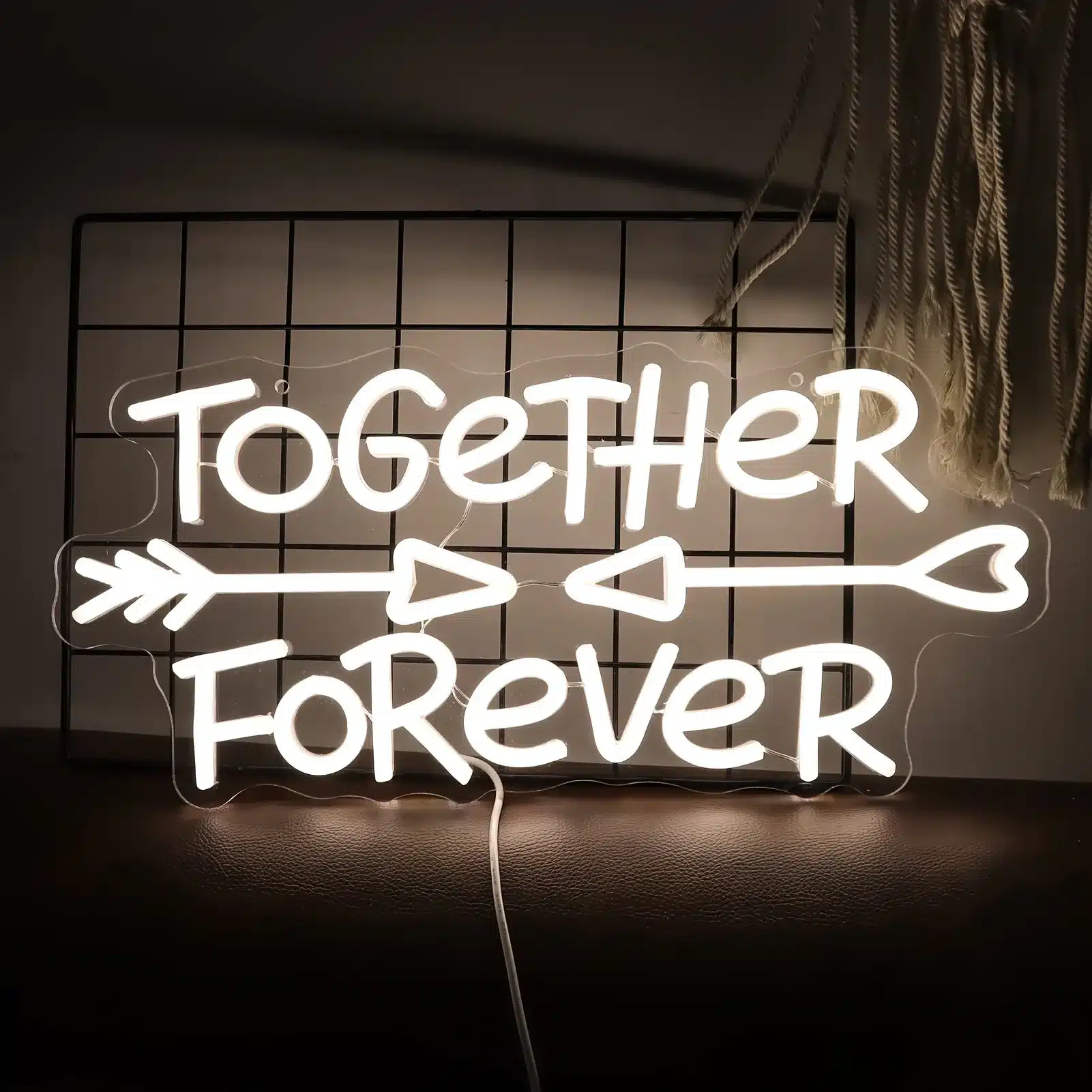 Le style d’écriture manuscrite du Néon Together Forever rappelle les déclarations romantiques écrites à la main, tandis que la flèche évoque Cupidon et renforce le message d’amour.