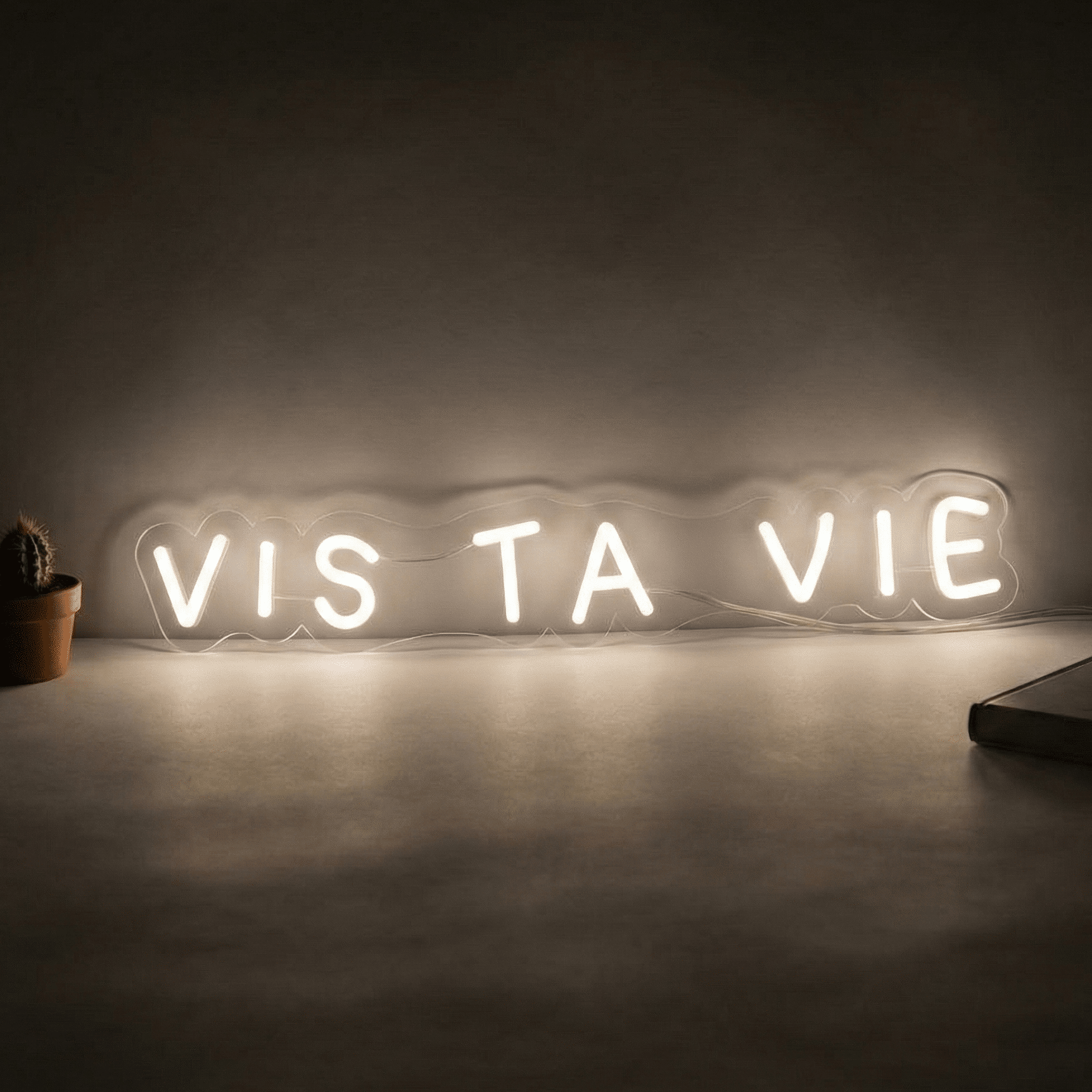 Le Néon Vis ta vie affiche l’expression française populaire “Vis ta vie” en lettres jaunes lumineuses sur trois mots distincts.
