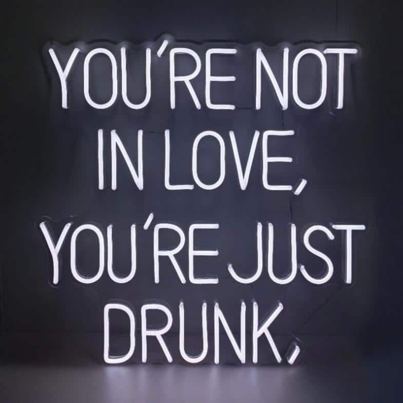 Le Néon You’re Not In Love, You’re Just Drunk affiche un message provocateur en lettres blanches lumineuses sur plusieurs lignes.